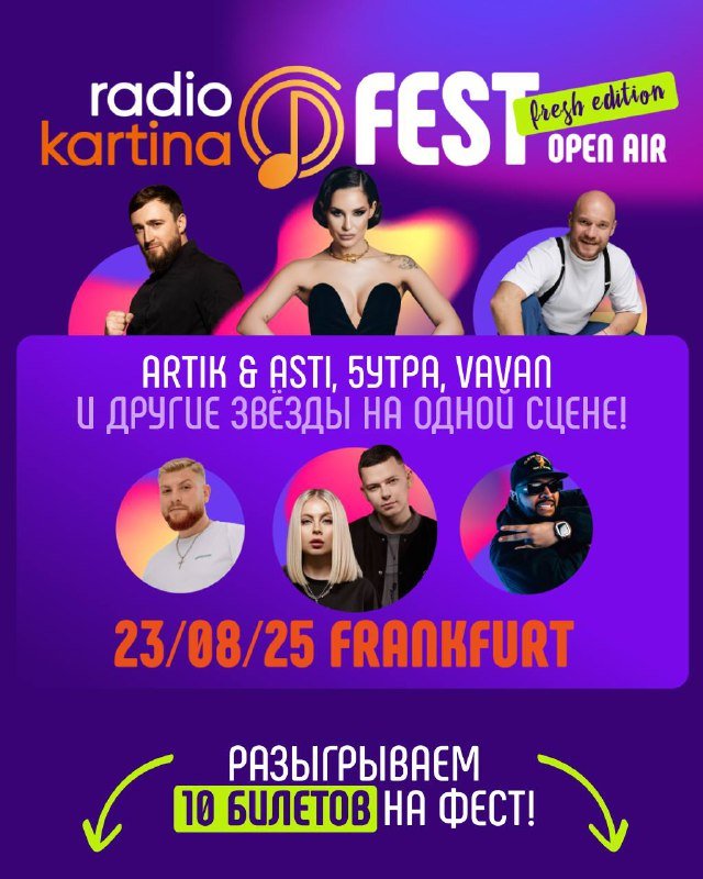 Radio Kartina Fest. Не пропустите ярчайшее событие лета! Artik & Asti (Seville), Султан Лагучев, 5УТРА, VAVAN и Jaschka Готовы стать частью незабываемого летнего приключения? 23 августа живописная открытая площадка Sommerwiese an der Jahrhunderthalle во Франкфурте станет эпицентром невероятного события – долгожданного летнего фестиваля Radio Kartina Fest! Radio Kartina Fest – это больше, чем просто музыкальный фестиваль. Это уникальная возможность провести время ярко, насыщенно и с пользой. На главной сцене вас ожидает фееричная музыкальная программа с участием мега-звезд: Artik & Asti (Seville), Султан Лагучев, 5УТРА, VAVAN и Jaschka, а также энергичный сет от DJ Loyza. На Radio Kartina Fest вас ждет не только выступление звезд первой величины, но и множество увлекательных активностей! Кроме того, вы сможете насладиться разнообразием вкусов на фуд-корте. А для отличного настроения – классические алкогольные коктейли и полезные безалкогольные напитки. VIP Зона — это особое пространство для гостей, которые ценят комфорт и эксклюзивность. В стоимость билета VIP входит: доступ в отдельную VIP зону с комфортными условиями, отдельная парковка, расположенная ближе к входу, отдельный вход без очередей, специальная зона с отдельной точкой продаж напитков, Welcome drink — приветственный напиток при входе. Продолжительность фестиваля с 15 до 22 часов. Подробности, условия, покупка билетов https://biletkartina.tv/ru/event/radio_kartina_fest